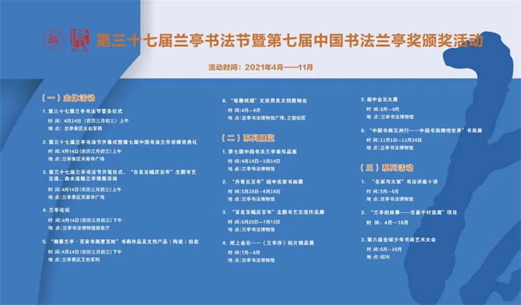 在这长达七个月的时间里,“笔墨纸砚”文房用具文创展销会、 “丹青五百年”越中名家书画展、纸上金石——《兰亭序》拓片精品展、越中金石大展、 “中国书画五洲行——中国书画拥抱世界”书画展、“名家与大家”书法讲座等活动将相继展开,精彩纷呈,让对书法文化艺术感兴趣的游客、观众尽享这场饕餮文化盛宴。