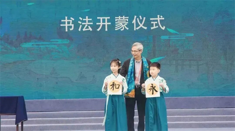 浙江省文联副主席、浙江书法家协会主席赵雁君上台为书法学童开蒙