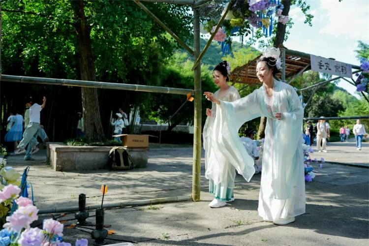 在曲水流觞区域处花神以花神祈福的演出形式,邀请游客参与。