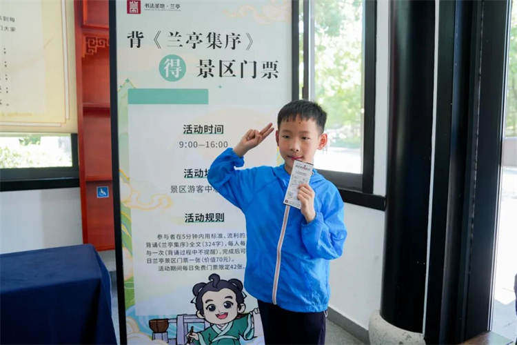 每日限42位游客参与,用标准、流利的普通话背诵在5分钟内完成《兰亭集序》全篇(324字)背诵,即可获得景区当天门票一张。