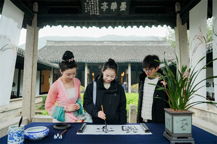 漫步景区,或许一个转身,你就能在流觞曲水畔、右军祠墨华亭或是兰亭江边三处花神打卡点,邂逅那位衣袂飘飘的“兰花神”。