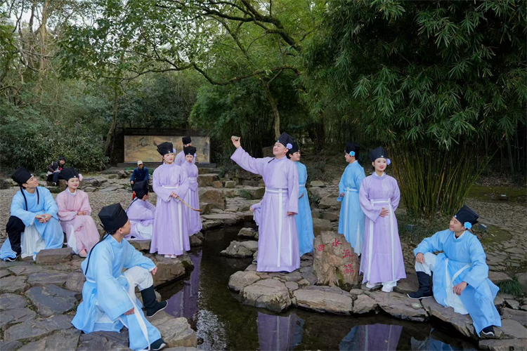 元旦佳节期间,演艺活动部精心打造的以竹林七贤为主题的升级版“户外演艺”正式亮相,成为景区最具人气的打卡点之一。在鹅池碑后的竹林间,演员们化身竹林七贤,或抚琴长啸、或纵酒放歌,生动再现了魏晋名士的洒脱情怀,还原了他们酣歌纵酒、谈玄说理的经典场景,让静谧竹林多了几分名士风骨;曲水流觞处,演员们重现永和九年三月初三王羲之邀友修禊集会的盛景,游客可沿曲水而坐,亲历“觞随水动、诗随觞来”的雅趣;十八缸旁,“东床快婿”的经典故事被情景再现,演员们以生动形象的演绎,展现了王羲之袒腹仰卧、率真洒脱的气度,让游客在欢声笑语中读懂典故背后的文化内涵;太子碑前,通过趣味演绎还原王献之临池学书的趣事,传递兰亭书法文化的传承之力。